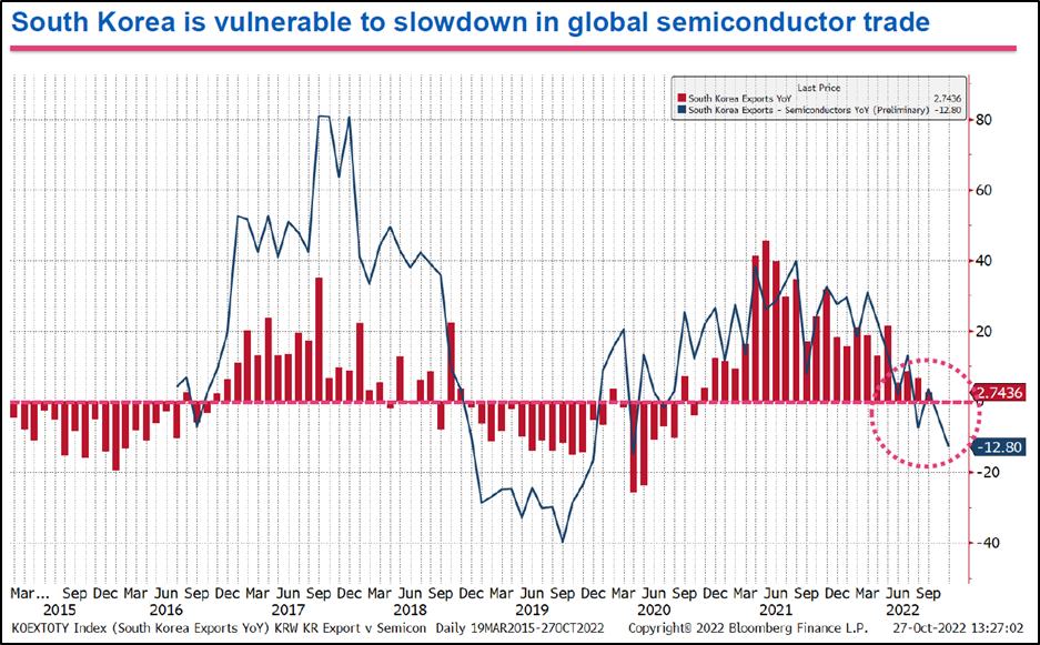 - 은행은 원화 약세가 우리나라의 대표적인 수출품목인 반도체 경기 추이와도 밀접하다고 판단함. 반도체 수출 약세가 내년에도 계속될 것으로 판단되기에 원화의 약세 추세 반전은 다소 시일이 걸릴 것으로 전망함.