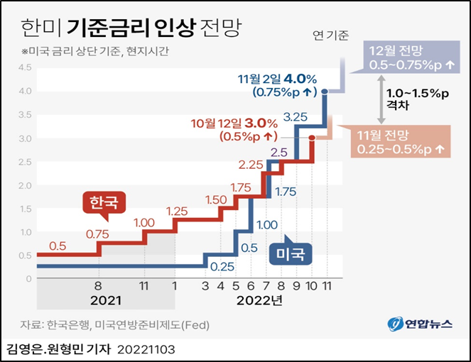 - 시장 예상대로 美 연준은 이번에 기준금리를 75bp 인상함. (3.75%~4.00%)