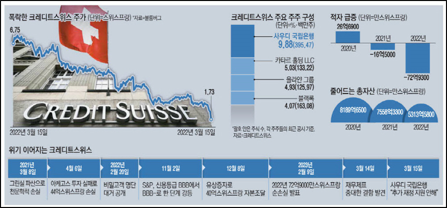 - 미국 은행들의 연쇄 파산 후 유럽계 은행 크레디트스위스(CS)에 대한 우려도 증폭하는 가운데 아직 위기의 규모를 가늠하기 어렵다고 세계 최대 자산운용사 회장이 진단했음.
